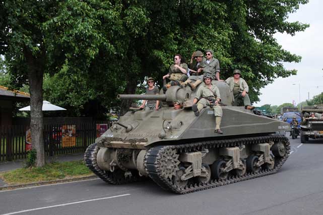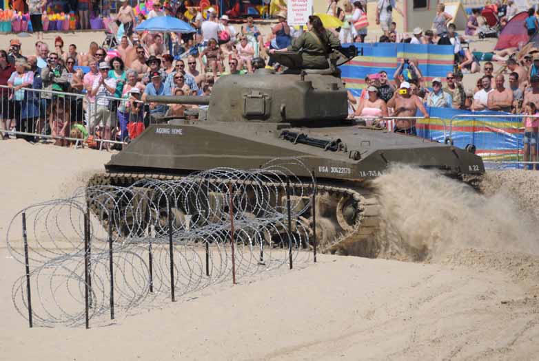 In all my time in this crazy world I had never ridden on a Sherman, so the offer of a ride into Weymouth was not to be missed. We had to do a quick change out of civvies into HBTs and I elected to keep on my ordinary brown shoes leaving my boots in the car. In no time we were off and Joris and I clung on the back, sometimes only just, as Jim drove the old girl down to the seafront. It was an exhilarating experience and I wish I had a photo of me on board. Unfortunately the only snaps I got were in my foot as I slid down the last few feet off the front on to the ground.