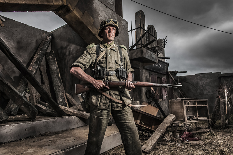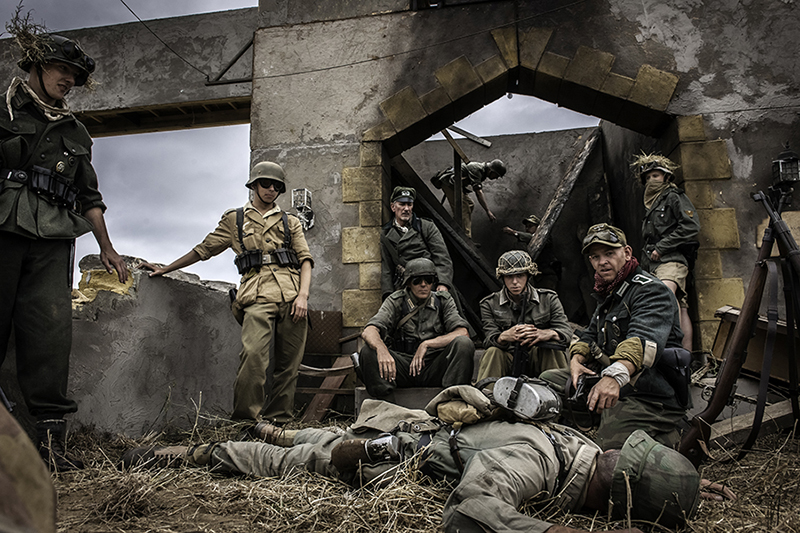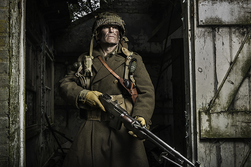“I avoid trying to replicate the look and feel of original war time photos, I understand it, but cannot see the point. My art school background comes from the perspective it’s all about creating something different and new. There are lots of great re-enactor photographers replicating WW2 style photographs anyway. Back in my studio the editing process is ruthless. In old money I choose one shot in approximately every 36 (like roll of film). In post-production I can then spend hours on each photograph, bringing in my painting expertise, painting into shadows and highlights. Again I stick to a purist attitude of 35 mm photography, meaning I never crop, add or subtract from the composition (a nod towards the great Magnum wartime photographers).