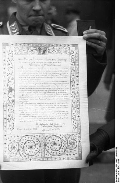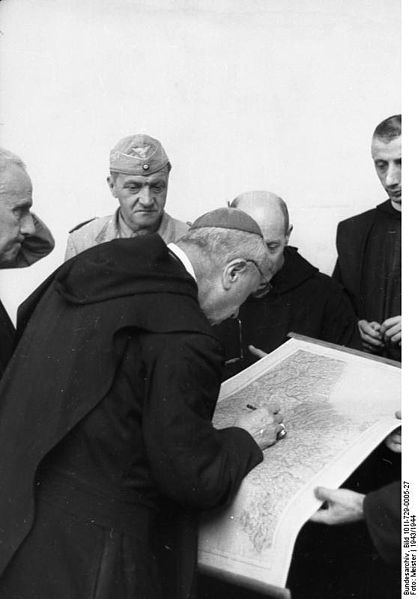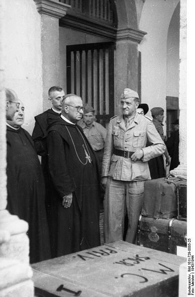 Abbot of Montecassino Abbey (left, with Pectoral Cross) supervises the packing of artworks from the Abbey about to be transferred to more secure places. The transfer was organized by the German Oberstleutnant (Lieutenant Colonel) Julius Schlegel (a roman catholic from Wien), Division “Hermann Göring” (right, in field uniform).