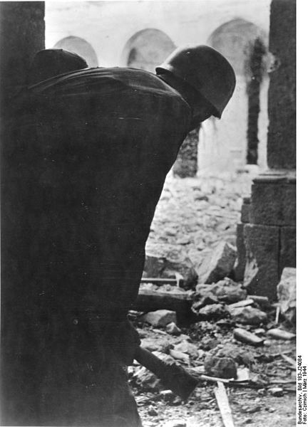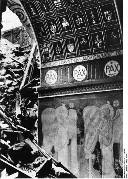 A destroyed part of the Abbey, first by Allied bombs and the by artillery fire the abbey was reduced to rubble. Note the word PAX on the walls, Latin for Peace.