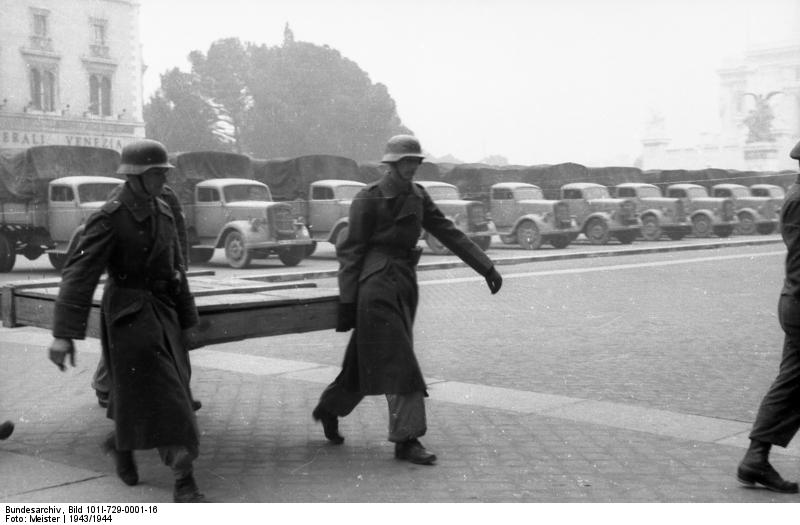 Works of art are being loaded into waiting trucks by soldiers of the Hermann Goring division.