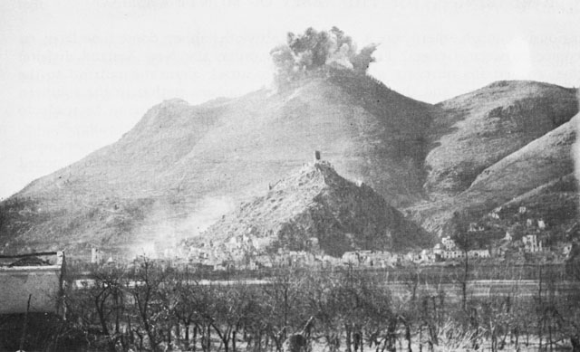 Empty charge cases at Cassino show the intensity of shellfire, March 1944.