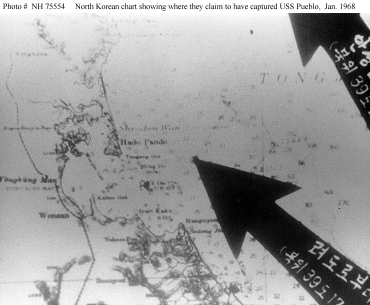 Though the Pueblo always stayed outside the 12 nautical mile border that International Law claims separates national sovereignty from international waters, the North Koreans insisted (and do to this day) that their sovereignty extends to 50 nautical miles and that Pueblo was in violation of this. Nevertheless, it was only after Bucher capitulated and the Pueblo was escorted to within that 12 miles, that she was boarded by a slew of high-ranking North Korean officials and the crew was taken into custody.