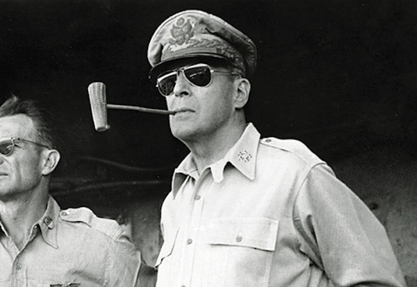 Like his contemporary, ‘Blood and Guts’ Patton, MacArthur had a number of fashion eccentricities such as his trademark aviator sunglasses and corncob pipe.