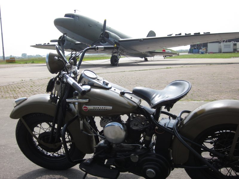 This Dakota Hunter Blog is a report of our Harley Club’s visit to Normandy. This year, on 4th June 2016, we gave an “acte de presence” at the “Batterie de Merville” Museum. With the Wartime built Harley Davidsons WLA/ WLC types and a Dodge Command car, we brought a tribute to a legendary D-Day veteran Douglas C-47/ Dakota. This contemporary workhorse C-47 was named in its heydays the “SNAFU Special” (Systems Normal, All Fouled Up) and that name, evidently, is applied again on its cockpit LH side, along with that most original 8-ball nose-art and the white “Invasion- striping” over the wings and the tail.