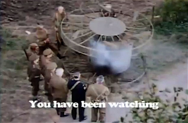 As the rockets continued to fire the Panjandrum spun erratically, and people (generals included) went running for cover. The cameraman was almost bowled over, and eventually the machine disintegrated. The dog of one of the army officers, present, chased down one of the rockets strewn on the beach.