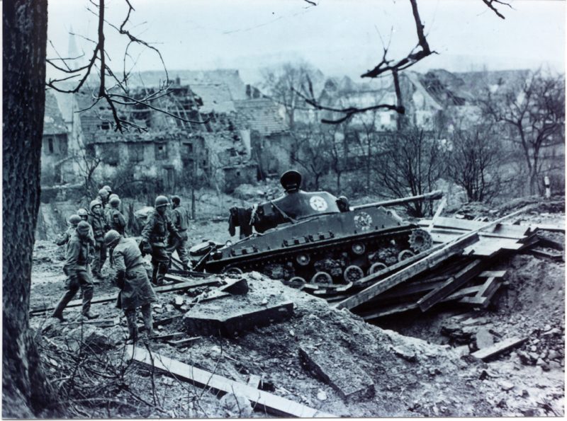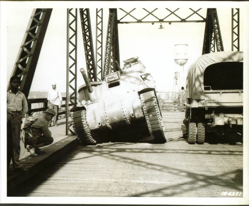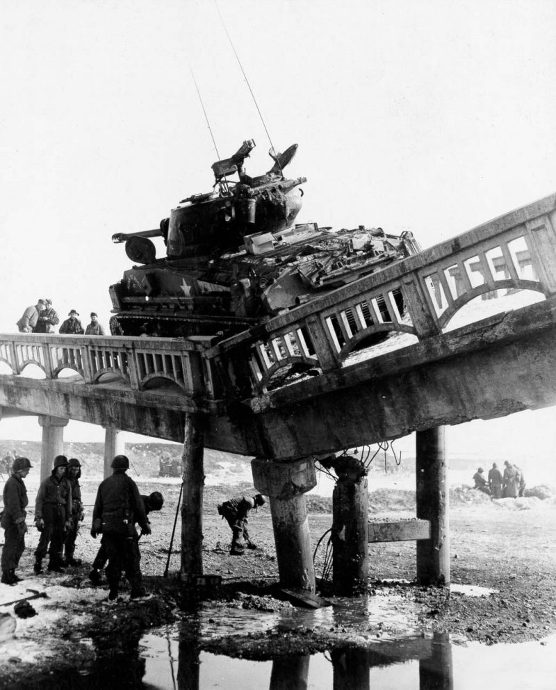 New M-4A3E8 tank on a bridge that collapsed with the weight of the vehicle during the operation against Grosblieberstroff on the Saar. The tank is from 749th Tank Battalion. Dated February 18, 1945. Archive Number 111-SC-233735.