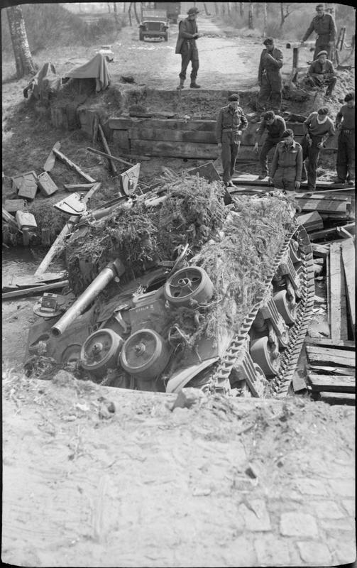 Recovery vehicles prepare to tow a Sherman tank of the Irish Guards out of a stream where it landed after collapsing a bridge on the slip road leading to the Bremen-Hamburg autobahn, 20 April 1945. The tank was eventually recovered undamaged.