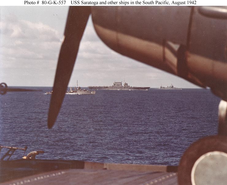 Photographed from USS Enterprise (CV-6) in August 1942, during the Guadalcanal Campaign. USS Saratoga (CV-3) is in the center, with a Farragut-class destroyer to the left and a New Orleans-class heavy cruiser to the right. Official U.S. Navy Photograph, now in the collections of the National Archives.
