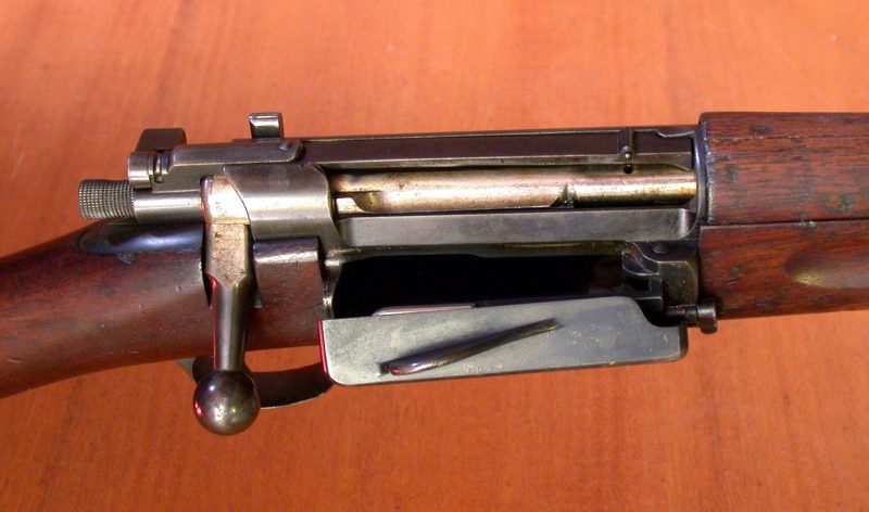 What mate the Krag–Jørgensen stand out was the magazine, at a time when many other rifles used an integral box magazine that had to be loaded using a charger or stripper clip, the Krag–Jørgensen used a magazine that was integral with the receiver. To load the rifle, you had to insert the cartridge into the opening on the right-hand side, a spring follower pushed them up, around, and into the action