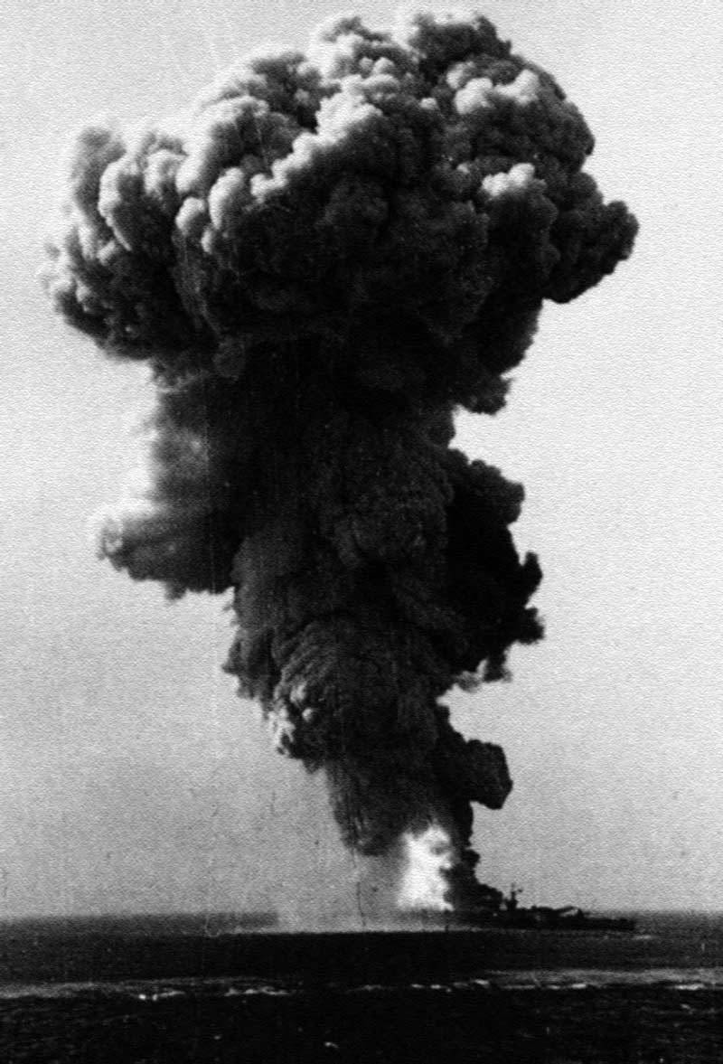 The huge explosion and black billowing smoke column give evidence to the incredible success of a secret guided gliding bomb named Fritz X.