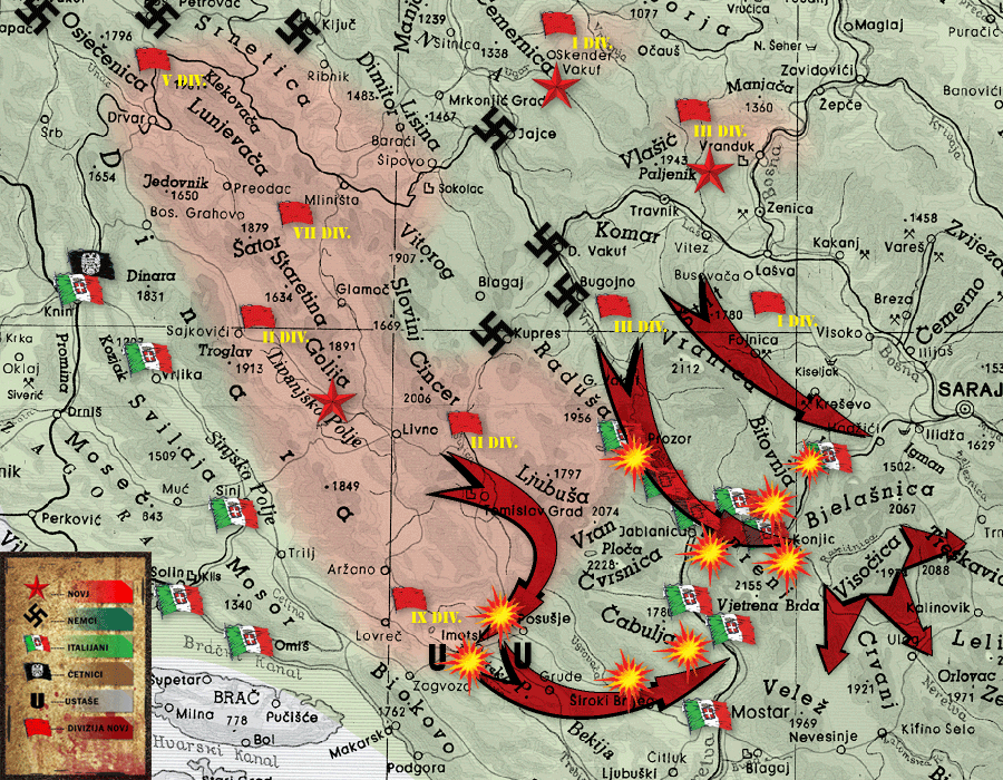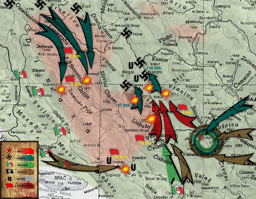 - 18th Italian army corps and 6th army corps with Chetniks – advance from the south and southeast.