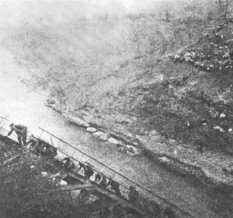 The same pioneer company that has destroyed the bridge constructed again a new, improvised bridge, resting on the skeleton of the old one. The Partisans crossed the river under intense aerial bombardment. The first unit that crossed the bridge immediately got involved in the fight against the Chetniks. The Chetniks completely collapsed and never recovered after this defeat.
