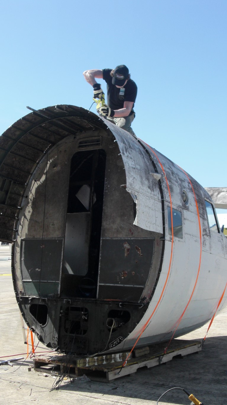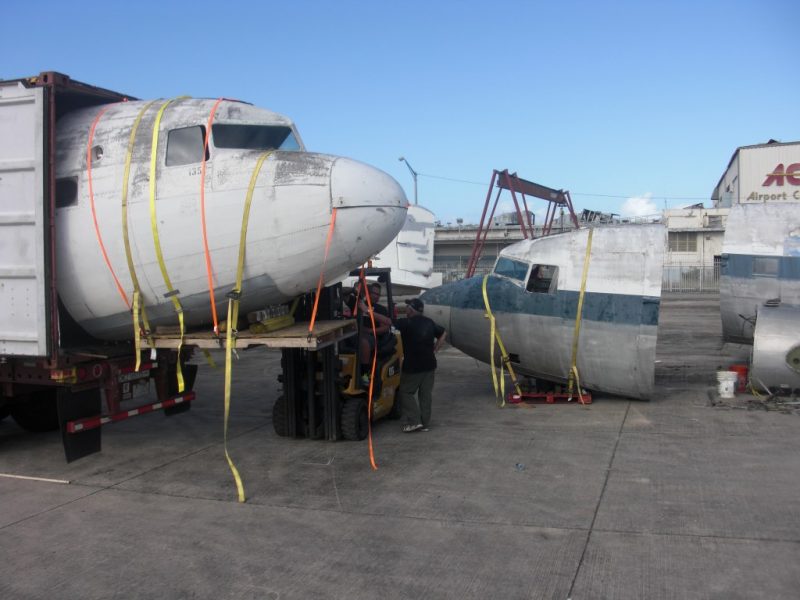 Here we enter in a bizarre gridlock of war relic museum pieces that are to be trashed soon, since there is no museum or private collector yet to be found in the world that can/will afford the transport from there. Many museums that want a C-47 on display simply wait for an occasion that one day an airframe will pop up from an airfield as a abandoned derelict in their state with low transport costs and gifted by the owner/airport. The overseas transport poses a big hurdle, but there was one American collector and friend of mine, Mark Bruce from Massachusetts who accepted that challenge. We made a deal to salvage at least 2 of the DC-3 cockpits from the shredder. That was the best we could do and was affordable with one 45 feet shipping container to be shipped to Boston. The labor factor was only to be kept within budget limits if we did the most part of the separation job with our own hands and tools. With good initial help form the local DC-3 wizard JuanAntonio Vega, Mark started the job and I flew in on Monday 16 March 2015 to join. Next day, time for some serious cutting into precious metal, the aluminum skins of 70 year old warbirds. With relatively simple tools, one small forklift truck and a primitive hand driven hoist, we started with the 2 of us the mission “Save the souls of the Caribbean DC-3’s”. A couple of most memorable days followed.