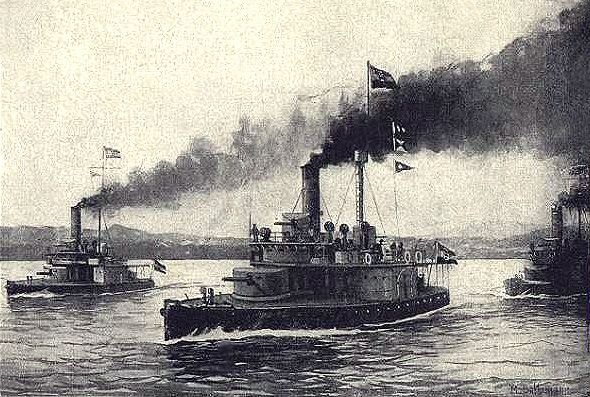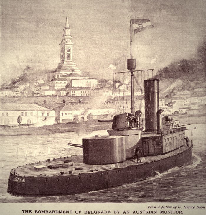 At approximately 23:30 on the night of 28 July, rifle fire erupted along the Serbian side of the Sava River. It began near the Kalemegdan fortress’ river wall, and then moved upstream towards the Sava landing. Loud cannon fire and explosions followed along the Serbian side of the river. The financial police and Gendarmes ran along the river bank, shooting at dark shapes on the water. Three Austro-Hungarian tugs pulling barges with infantry had tried to land near the lower fortress of the Kalemegdan, but veered away after coming under intense rifle fire. The barges were escorted by a heavily armored river monitor, which began shelling the Kalemegdan and the city with its 120-mm guns.