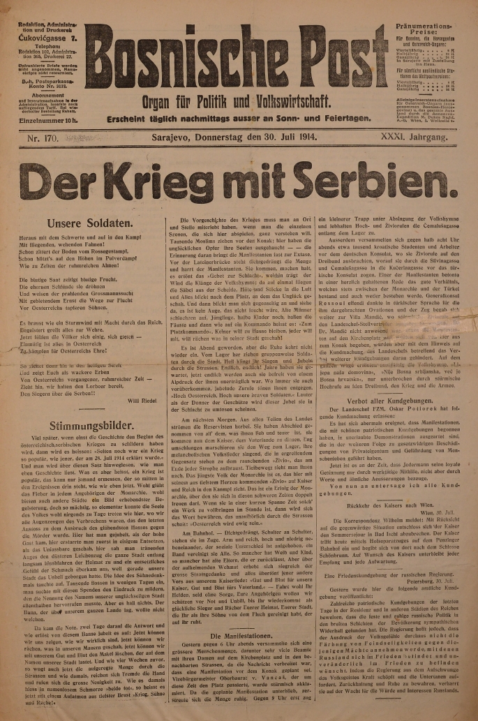 The Austro-Hungarian declaration of war arrived in Serbia via open telegram around noon on 28 July, and all of Belgrade soon knew its contents. Shops closed as people rushed to hoard food and supplies. Rumors that the city’s water supply would be turned off prompted crowds to form around the many public fountains. The Chief of the General Staff, Vojvoda Radomir Putnik, was at a spa in Austria-Hungary with the key to the safe holding Serbia’s mobilization plans; the safe had to be dynamited open.