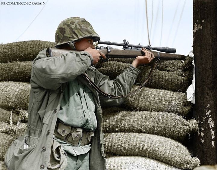 A US Marine marksmen with a Springfield M1903AI/Unertl Sniper rifle watches from behind a barricade for a North Korean sniper to show himself in Seoul, on September 28, 1950 (Colorized by Noah Werner Winslow)