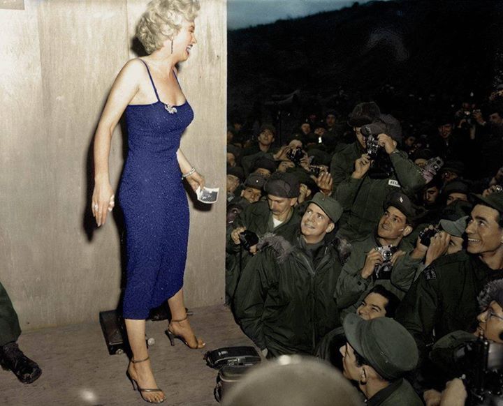 Marilyn Monroe poses for soldiers in Korea after a USO performance at the 3rd U.S. Inf. Div. area, February 17, 1954.