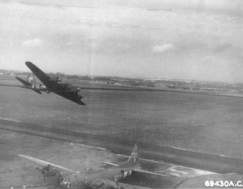 title="B-17F Fortress aircraft of the 91st BG, 8th Air Force executing a low fly-over during a demonstration at Bassingbourn, England, United Kingdom, 1943 [Via]"