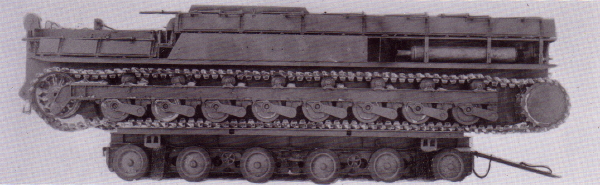 The chassis was loaded onto a six-axle Culemeyer-Strassenroller lowboy trailer. The other parts of the gun were lighter and used four-axle trailers. If the trailer with the chassis on board had to cross a bridge that couldn’t carry their combined weight the chassis had to be off-loaded and driven across under its own power.