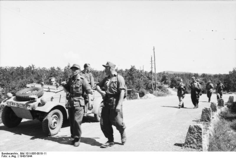 Yugoslavia, 1943. Soldiers march past a Kubelwagen during an anti-partisan operation. – By Bundesarchiv