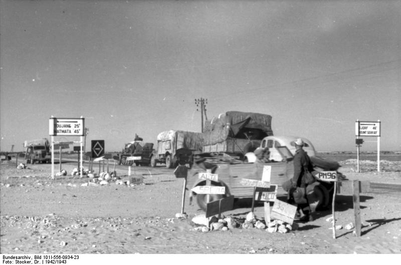 North Africa, August 1942. German soldiers pass an improvised road sign. – By Bundesarchiv