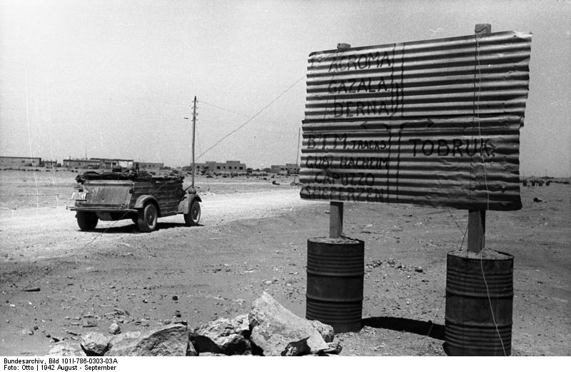 North Africa, Tobruk, August 1942. Soldiers in a Kübelwagen near a No Entry sign. – By Bundesarchiv