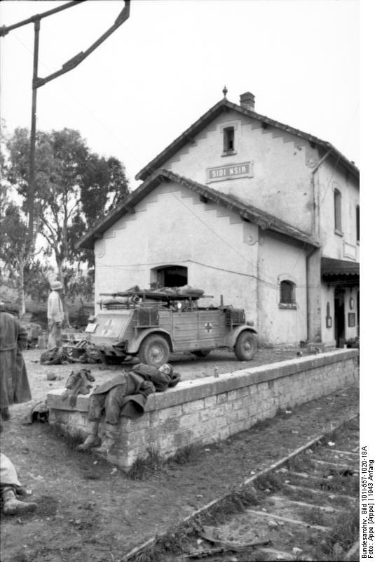 North Africa, Tunesia, Sidi N’sir, February 1943. German Soldiers at a railway station in use as an aid station for wounded prisoners of war. – By Bundesarchiv