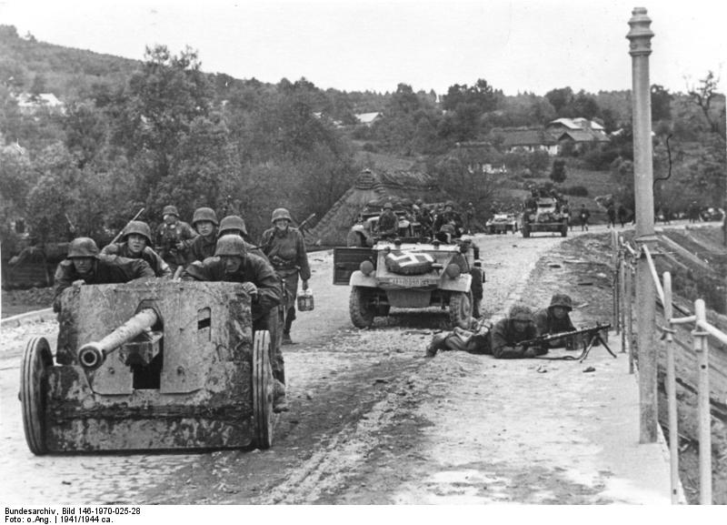 Balkans (probably), 1941. Waffen SS troops with a 5cm PAK 38 anti tank gun accompanied by a MG-34 machine gun on a street. Note the swastika on the Kübelwagens spare tire. – By Bundesarchiv