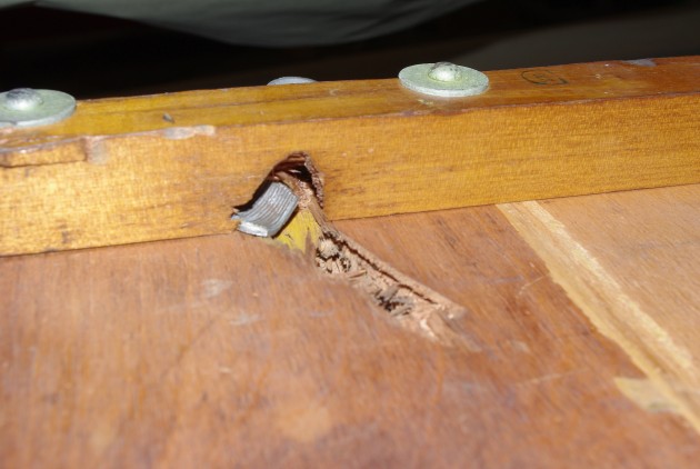 After retrieving an original floor board of the plane from storage as part of the reconstruction and conservation project, conservators found a previously undocumented surprise: a German round lodged in the panel beneath the radio operator’s seat. Though it will be hidden from view when the plane is completely reassembled, the project team feels it’s important to leave it in place as a testament to the battles the plane endured. (Photo by Michelle Z. Donahue)