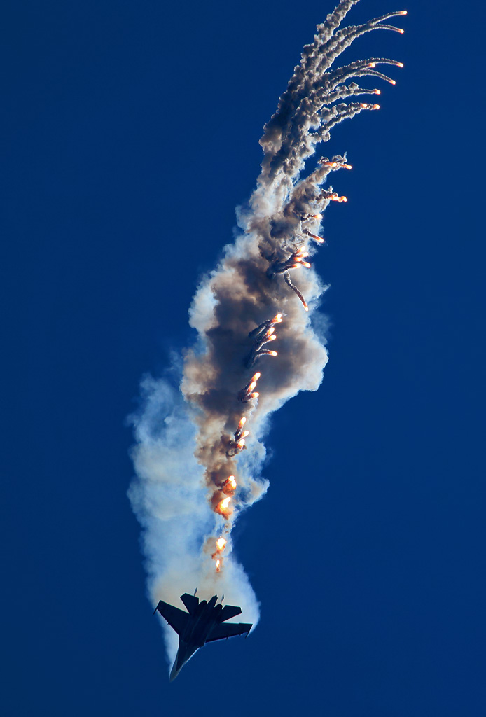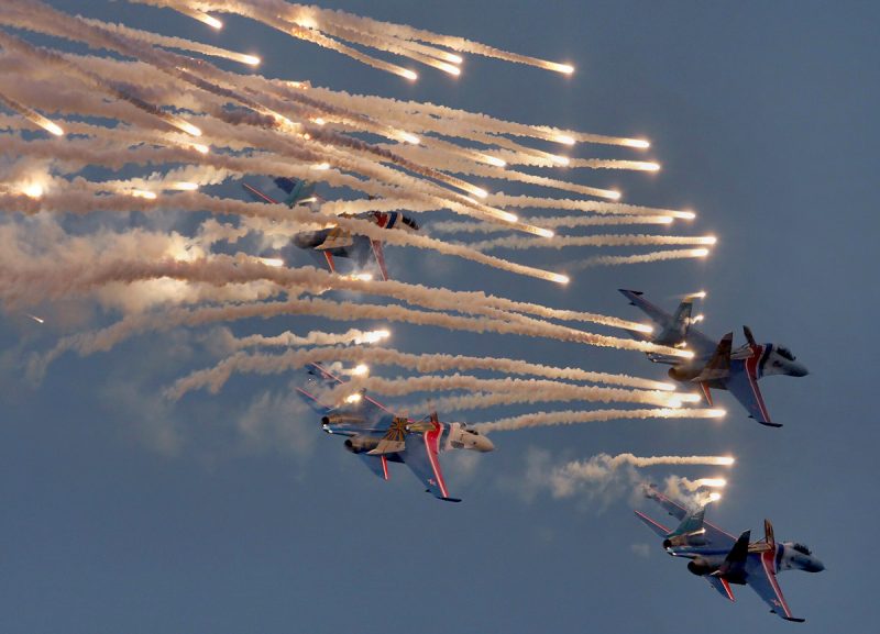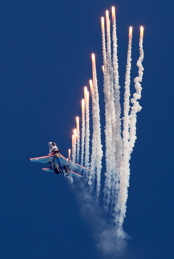 The Russian Knights are an aerobatic demonstration team of the Russian Air Force. Originally formed on April 5, 1991 at the Kubinka Air Base as a team of six Sukhoi Su-27s, the team was the first to perform outside the Soviet Union in September 1991 when they toured the United Kingdom.