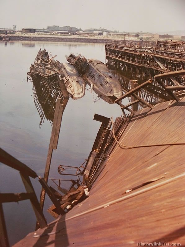 Two wrecked German submarines at dockside in Hamburg, Germany, after Allied bombing. Shipyards were rebuilt a few times, but after the heavy…