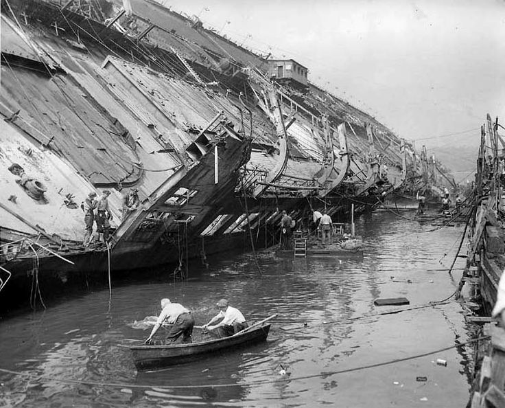 New York City, c.1942, The SS. Normandie capsized after going up in flames in New York Harbour