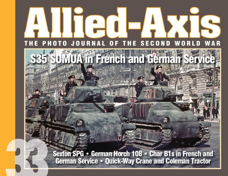 The latest in this long-running series showcases the S35 SOMUA tanks in French and German Service; the British Sexton Self Propelled Gun; the German Horch 108 Heavy Car; the Char B1s in French and German Service, and the U.S. Quick-Way Crane and Coleman Tractor. Like others in the series, Allied-Axis 33 presents individual articles that are composed of large, clear historical photos that are often accompanied by contemporary walk-around images.