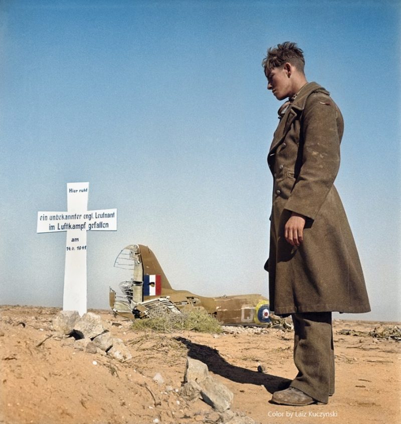 This is a famous photo taken by the British War Correspondent, George Rodger. It is of a British soldier standing by the grave of an English Flight Lieutenant and the inscription reads;