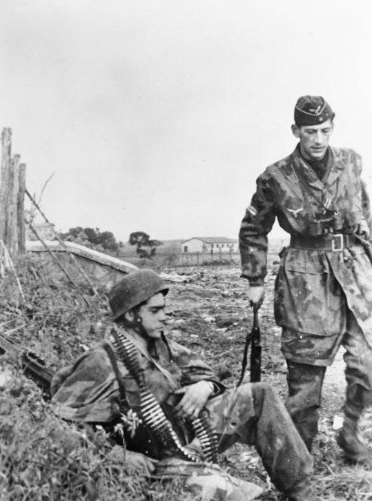 German Paratroopers from Fallschirmjäger-Regiment 5/Division Hermann Göring during the march on the Italian front on 1 October 1943. Some were carrying MG 42. They were the few remnants from the Tunisian campaign, during their short stay in Italy before leaving for the eastern front in early November 1943.