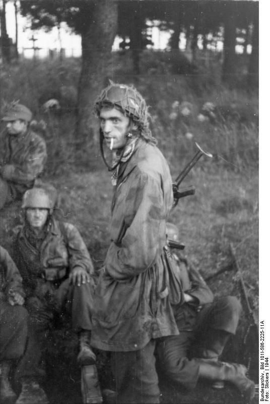 Camouflaged German paratrooper with Panzerfaust, France, Jun-Jul 1944