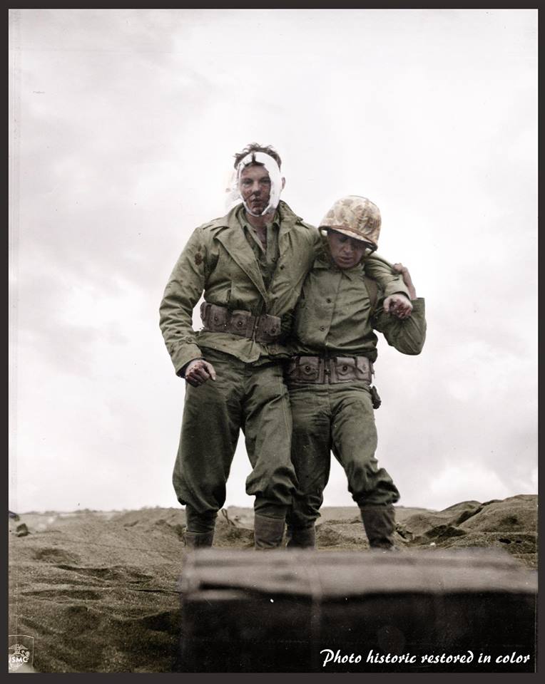 Nick also cornered a Japanese officer as they made their way through the brush. He ended up with his rifle on him. O’Neil was scanning flicking his eye toward his buddy. Nick said it seemed like forever, but he could see that the soldier was of some rank and thought he should be taken back for questioning. So they took him back to their field leader. On Iwo Jima, heavy fire started as they made their way up the beach. O’Neil was hit by mortar fire and Nick bandaged and helped O’Neil back to the boat that would take him to the hospital ship. “There were shells flying all over the place and all of a sudden I saw ‘Plug’ running back with both hands on his face,” he added. “So I grabbed him, seen he was hit and took him back to the landing craft.” Staff Sgt. Dalphonse ended up taking charge of the remaining men after losing their platoon leader.Bob O’Neil account: A mortar blast flipped him into the air, shredding his head and face.He remembered spitting out blood and teeth as Nick Dalphonse crudely bandaged his head and helped him back to the shoreline to catch a boat to a hospital ship. Along the way, a Marine photographer snapped a picture of Dalphonse supporting his wounded, towering buddy.Bob O’Neil’s wife, Betty, said her husband once told her how angry he was at being photographed at that moment. She recalled, “He said, ‘My head is killing me and this guy’s taking my picture?’ That’s why his hand is clenched in the picture.”(The photographer was Corporal Eugene Jones, also of the 4th Division.) Robert O’Neil died in 2002 aged 78. Nick Dalphonse aged 91 in 2014 (and may still alive today) (Colourised by Johhny Sirlande from Belgium) https://www.facebook.com/pages/Historic-photo-restored-in-color/1480581562215951