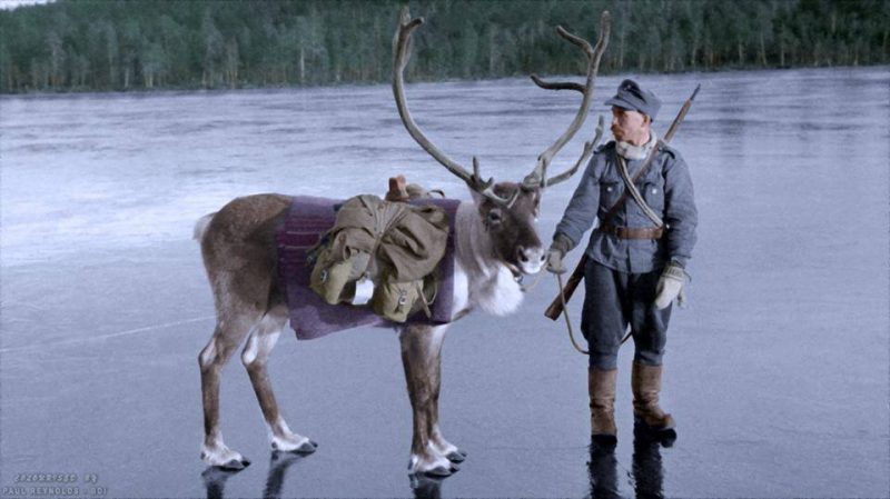 A Finnish soldier with a pack Reindeer, on an ice covered lake, near the tiny village of Nautsi, in northern Lapland, Finland.