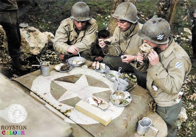 “Left to right, PVT John A. Quinn, 163rd Signal Photo Company, Syracuse, N.Y., PFC Bennett Fenberg, Detroit, Mich., of 163rd Signal Photo Company, and CPL Harry Koppelman, Cleveland, Ohio, 3rd Division, Hqs., enjoy their Christmas dinner on the hood of a jeep.” San Felice area, Italy. 25th of December 1943.