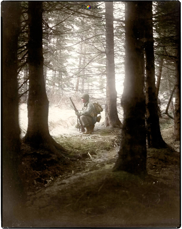 Staff Sergeant George W. Talbert of the 3rd Battalion, 18th Infantry Regiment, 1st Infantry Division on the lookout in a forest near Sourbrodt in Belgium. 19th December 1944.