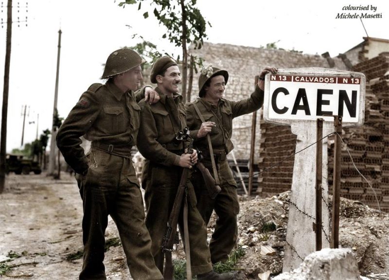 Canadians, Bernard Hoo, John McConville and JR Kostick all of the Canadian Royal Engineers, 9th Brigade, 3rd Canadian Division, stand at the west entrance to the city of Caen on the 9th of July 1944.
