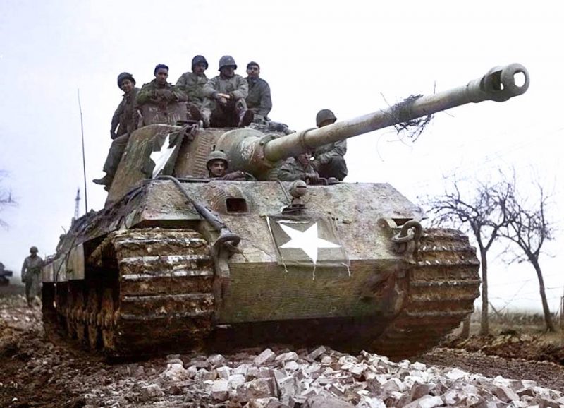 The ‘Tiger’ took a hit to the base of the turret that jammed it at the 3 o’clock position. A heavy wrecking truck was used to ‘twist’ the turret to the forward position and the US soldiers, seen here, are probably engaged in a battlefield clearance operation. (see the attached video)