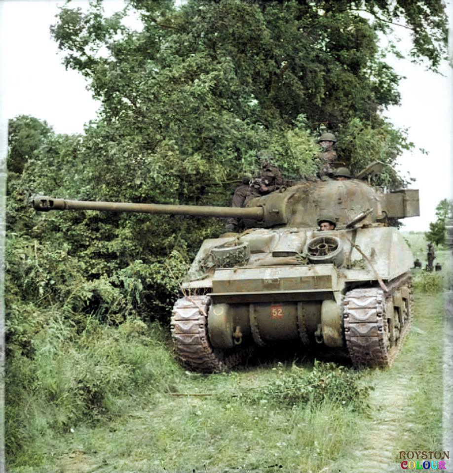 A British Sherman VC ‘Firefly’ (Medium Tank, M4A4) of ‘C’ Squadron,The Staffordshire Yeomanry, 27th Armoured Brigade in the vicinity of Lebisey Wood, north of Caen, Normandy.