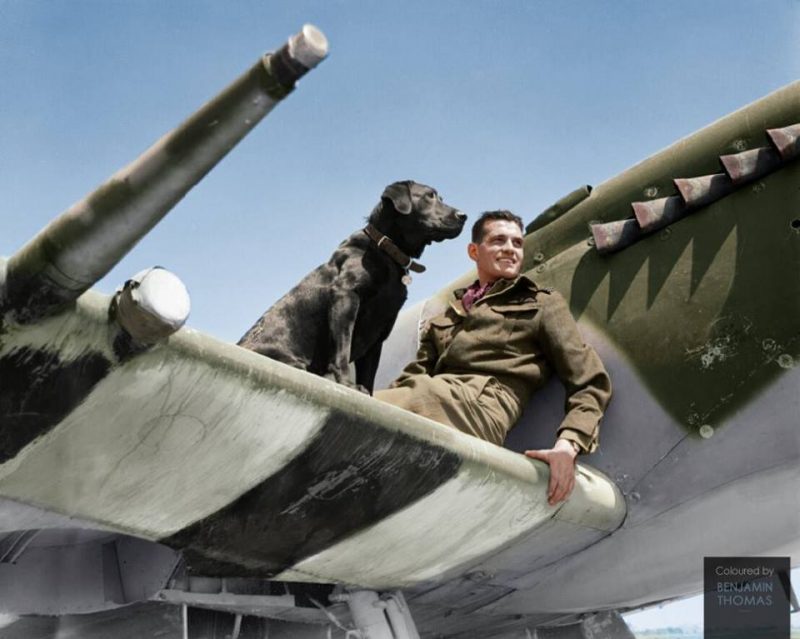 Wing Commander James Edgar ‘Johnnie’ Johnson DSO & 2 Bars, DFC & Bar, commanding No. 144 (Canadian) Wing, on the the wing of his Supermarine Spitfire Mk IX with his Labrador retriever ‘Sally’, at Bazenville Landing Ground in Normandy. 31st of July 1944.(nb He is seen here wearing an RAF issue Battle Dress Blouse in Khaki often worn by Australian pilots in the Middle East and Italy) Johnson had been interested in aviation since his youth, and applied to join the RAF; initially rejected, first on social, and then on medical grounds, in August 1939 he was eventually accepted. An old rugby injury caused problems during his early training and flying career, resulting in him missing the campaigns in the Low Countries and France and the Battle of Britain. In 1940 Johnson had an operation to reset his injured collarbone, and began flying regularly.He took part in the offensive sweeps over German-occupied Europe from 1941 to 1944, almost without rest. By late June 1944, Johnnie Johnson surpassed the record 32 victories of “Sailor” Malan which was highly publicised by the press. Johnnie emphasised that “it was the duty of any leader to have their pilots destroy as many enemy aircraft as possible, not gain personal victories”. “Teamwork was essential to ensure a maximum offensive and defensive effectiveness, flushing out and stalking the enemy to bring as many guns to bear as possible”.