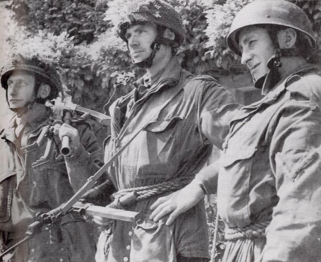 Captain Priday (centre), the Second-in-Command of “D” Company, 2nd Oxford & Bucks Light Infantry, together with two men of No.4 Platoon, Private Frank Gardner (left) and Lance-Corporal B. H. Lambley. Their glider had landed eight miles from Ranville Bridge and it was not until the 7th June that they were able to rejoin the Company.