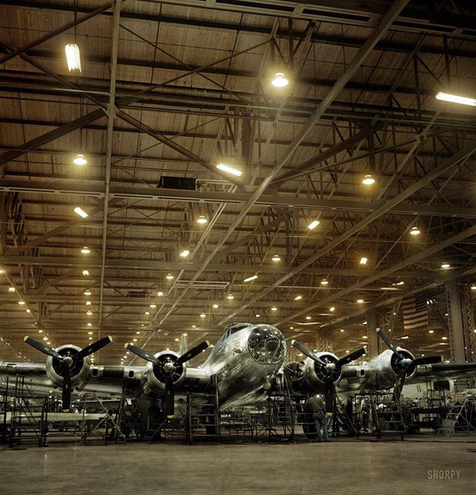 December 1942, a year after Pearl Harbor. “Production. B-17 heavy bomber. A nearly complete B-17F ‘Flying Fortress’ at Boeing’s Seattle, Washington plant.”