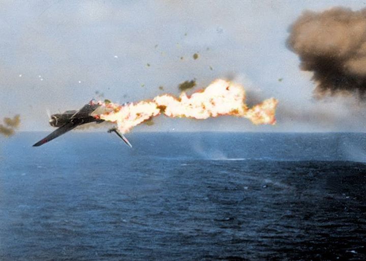 Deck side account, “At 300 yards, the Japanese plane took a shell in its left wing and flames spurted out. The pilot then veered to try to crash into the Yorktown, skimming the flight deck so close that the flames singed the beard of one of the Yorktown gunners. The plane finally crashed into the sea 100 yards close aboard and exploded in a ball of smoke and flame.”