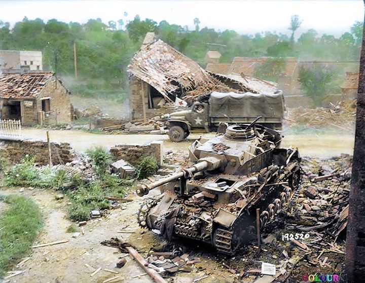In a village left in ruins, a US Medical truck passes behind a wrecked Panzer IV Ausf. J medium tank of the 2.Panzer-Division.