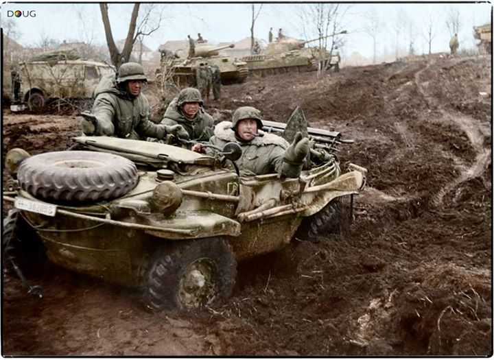 This photo was taken in the Vinnitsa (Vinnytsia) area of the Ukraine in November 1943. The man at the wheel is SS-Hauptsturmführer Gustav Knittel, the commander of the 1st SS Aufklärungs-Abteilung LSSAH at the time. The number plate is 302098, and the vehicle is one of the original Porsche Vorserien Schwimmwagens (literally Floating/Swimming Car) assigned to the LAH in the middle of 1942.